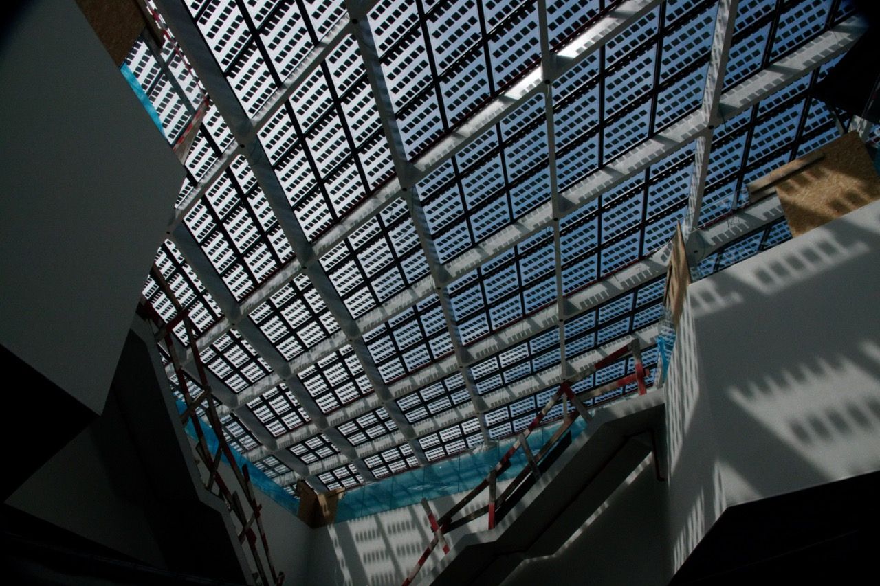 The new bus station consists out of one central platform and two lateral side platforms, used at peak hours. The main hall of the central platform is covered by photovoltaic panels integrated in the glass of the roof. This will completely cover the electrical consumption of the new building thanks to a renewable energy.
