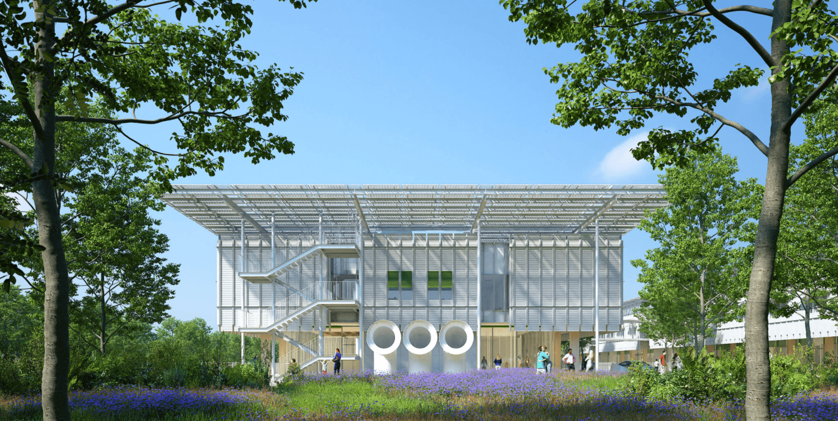 Clinical functions are organized to benefit from natural light and views of the park, while public areas are open and transparent at street level. A solar canopy equipped with photovoltaic panels provides renewable energy and climate protection, reinforcing the project’s environmental approach. Constructed with extensive use of timber, the hospital combines sustainability, comfort, and clarity in its architectural expression.
